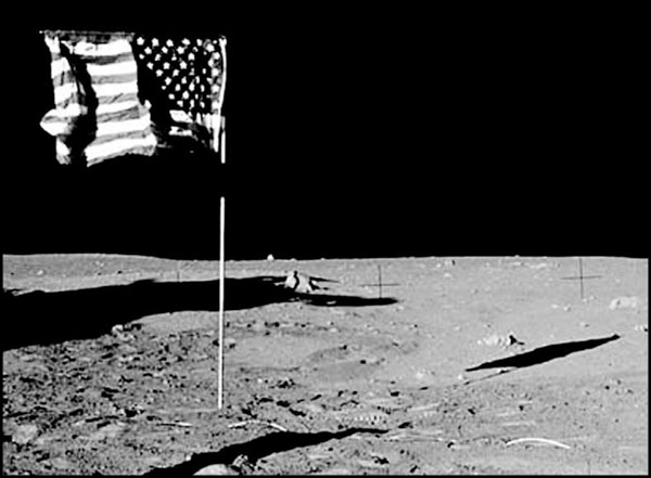 – Посмотрите: флаг примерно высотой с астронавта. Отчетливо видны тени, падающие от его ног. На этой фотографии эти тени не сходятся, то есть тень до того длинная, что тут не видна даже ее половина (пояс астронавта не виден на тени). Следовательно, тень от полотнища флага за кадром, а тень от древка малозаметна.