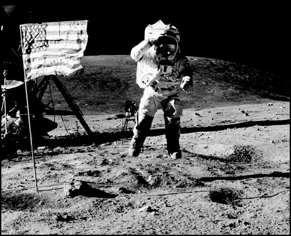 – А вы посмотрите получше. Есть там тень от астронавта – справа от него и пониже. Дело в том, что Джон Янг, изображенный на этой фотографии, решил подпрыгнуть и в прыжке отдать флагу честь. А его напарник Чарльз Дьюк сумел поймать на снимке момент, когда Янг был в воздухе… тьфу, в вакууме! (Впрочем, из-за малого лунного притяжения поймать этот момент было, наверно, не очень сложно.) Поэтому астронавт и его тень не соприкасаются.