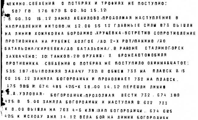 Шестое: 413 сд в 13.00 овладев: Подосинки. Замятино, с 13.00 дивизия с частями связи не имеет и положение частей к 13.00 неизвестно. Штадив – Пещерово.
