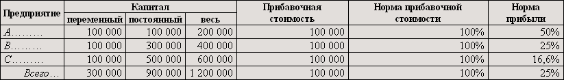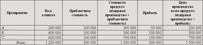 В каждом из трёх предприятий занято по 100 рабочих, получающих в год заработной платы по 1 000 марок. Норма прибавочной стоимости составляет 100%. Общая сумма выданной заработной платы равна, следовательно, 100 000 марок, а прибавочная стоимость также равняется 100 000 марок. Постоянный капитал в предприятии A составляет 100 000 марок, в предприятии B — 300 000 марок и, наконец, в C — 500 000 марок.