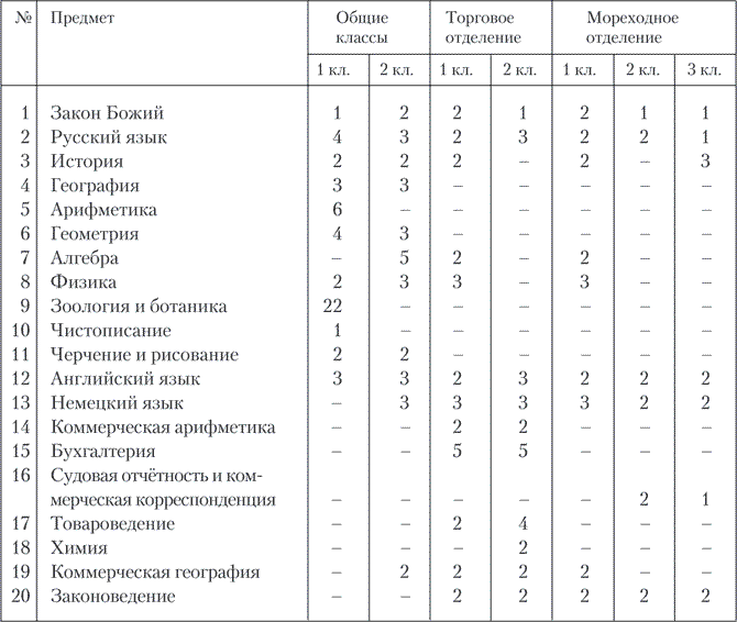 В училище было два отделения – торговое и мореходное. В торговом готовили специалистов для работы в торгово-промышленных учреждениях. Обучались там четыре года: два года в общих классах по общеобразовательной программе и два года в специальных классах, где приобретали профессиональные знания и навыки. В мореходном отделении, готовившем шкиперов и их помощников для плаваний на торговых судах, учились пять лет: два в общих классах, три в специальных. Обучаться могли юноши всех сословий, находившихся в русском подданстве. По статистическому отчету 1907 года в училище было 63 ученика.[22] Из них сыновей дворян – 8, духовного звания – 2, почетных граждан и купцов 1-й гильдии – 13, мещан – 18, крестьян – 22. Училище было весьма демократичным заведением.