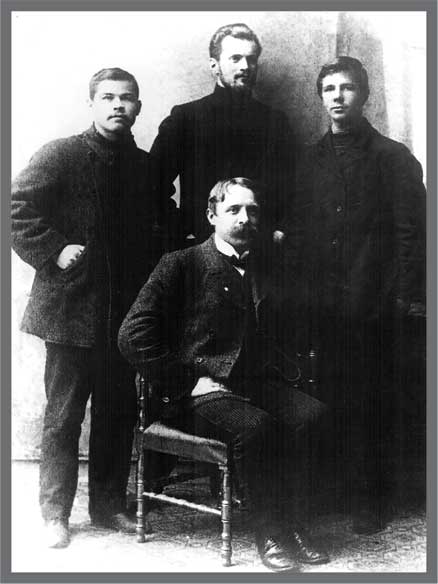 Сотрудники издательства «Помор». Сидит А. Эгеде-Ниссен, стоят слева направо: П. Ф. Гусев, Н. А. Шевелкин, А. С. Кучин. Вардё, 1906 г. (Из фондов МАМИ)