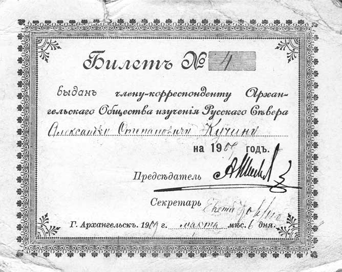 Билет члена-корреспондента Архангельского общества изучения Русского Севера А. С. Кучина. 1909 г. (Из фондов МАА)