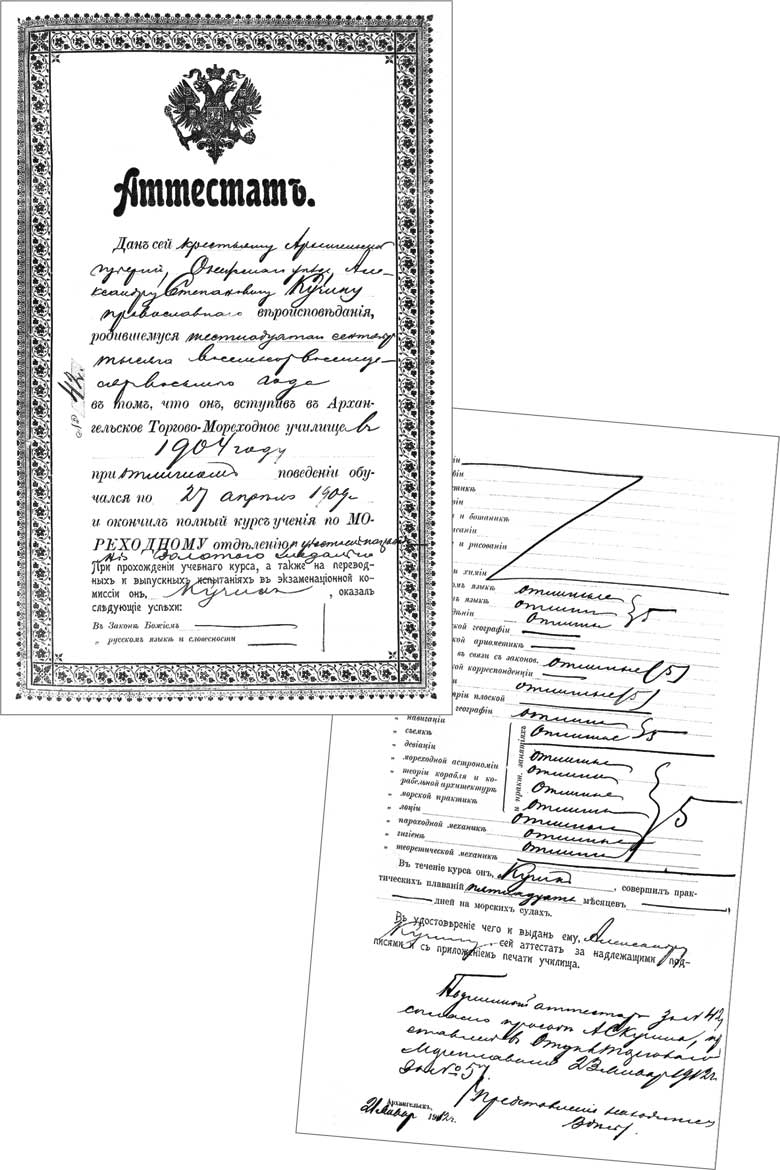 Аттестат А. Кучина об окончании Архангельского торгово-мореходного училища. 1909 г. (Из фондов ГААО)