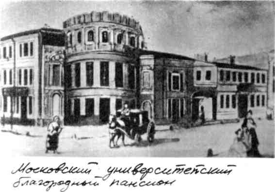 Полностью назывался Московским университетским благородным пансионом. Простые крашеные полы, простые зеленые скамейки и учебные столы. Простые учебные коридоры и холодные каменные лестницы. Помещался на Тверской улице между двумя Газетными переулками. Теперь на этом месте здание Центрального телеграфа угол улицы Горького и Огарева. Здание было «в виде большого каре, с внутренним двором и садом».