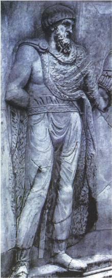 Германский пленный, рельеф Новой арки императора Диоклетиана. Согласно традиции, друидическая жрица из Галлии предсказала ему обретение власти после убийства дикого кабана (по-латыни aper). Вскоре Диокклетиан убил префекта преторианцев Аира, подозревавшегося в убийстве императора Нумериана, и после этого был отозван из войска и посажен на трон.