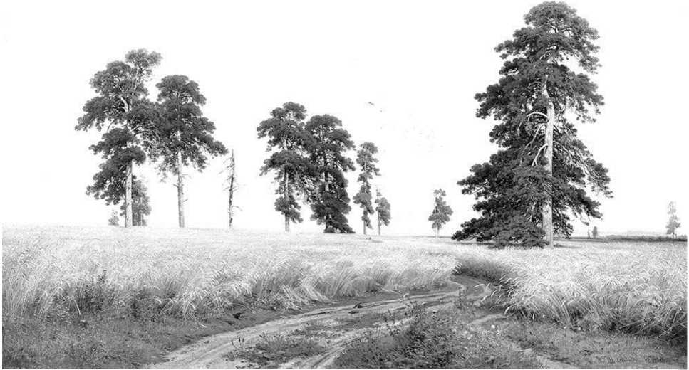 Если снова обратиться к пейзажной живописи, а точнее, к одной из самых известных картин Шишкина 1878 года «Рожь», то можно заметить не саму рожь, а кривые сосны.