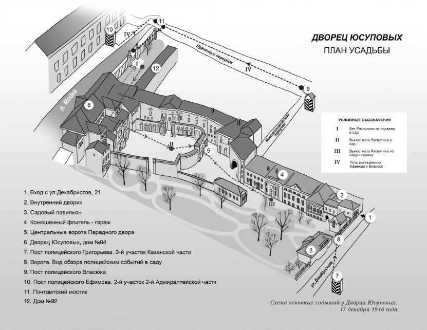 «Петербургская газета» сообщала: «№ 94 – это Юсуповский особняк, помещение, в котором расположены квартиры князей. Дом этот выходит всем фасадом на Мойку. Рядом с ним расположен особняк, выходящий в сад. Особняк этот отодвинут от набережной Мойки внутрь сада. Расположение домов наглядно показано на плане. Проход в особняк № 92 устроен под воротами первого двухэтажного дома, в котором помещается типография. Вход во внутренний двор довольно грязный, но этим входом, по показаниям служащих графа, пользовались все негласные гости.