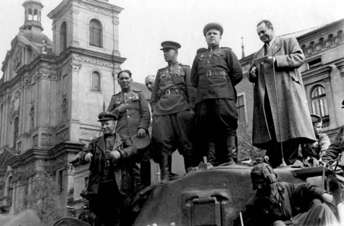 После освобождения Йиглавы. Начальник политотдела армии генерал К. И. Филяшкин (в центре) и командир 30-й гв. мбр полковник И. Я. Воронов (крайний слева). Апрель 1945 г., Чехословакия
