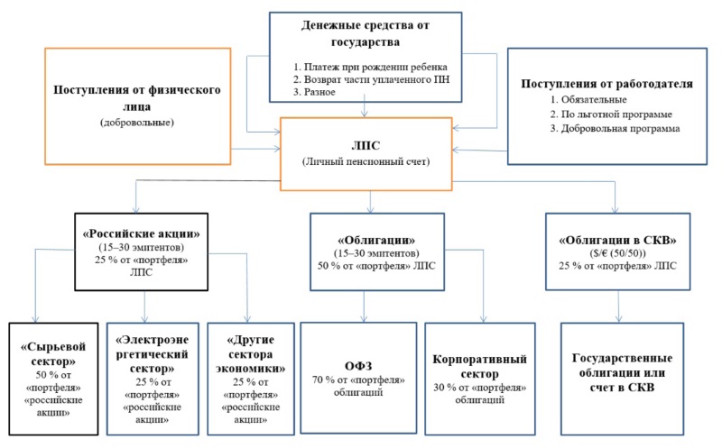 Удельный вес каждого счета (субсчета) должен быть фиксированным без возможности изменения извне. Данная фиксация является не только инструментом снижения рисков (различных) но и встроенным регулировочным элементом общего механизма трансформации сбережений в инвестиции. В зависимости от экономической необходимости общий поток ДС может быть увеличен/уменьшен по основным сегментам (акциям, облигациям). Например, если стоимость акций существенно завышена, то на законодательном уровне (документ ЦБ РФ) доля субсчета «Российские акции» может быть уменьшена и т. д.