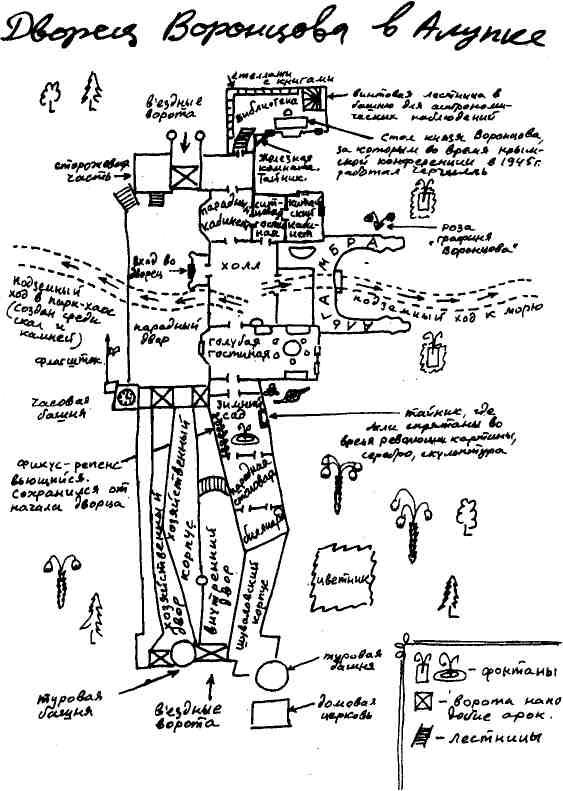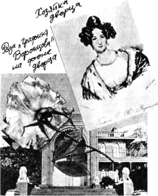 Двор — северный фасад дворца с двумя тюдоровскими эркерами-выступами — полон экскурсантами: здесь формируются группы для посещения. Во дворе нас ждали Майя Карабанова и Вика. Анна Абрамовна всех нас ведет теперь вокруг Шуваловских покоев к южному фасаду дворца, напоминающему вход в индо-мусульманскую мечеть и называемую Альгамброй — в честь арабской крепости на юге Испании. Галиченко хочет показать куст знаменитой розы «графиня Элизабет Воронцофф», или, если проще, «графиня Воронцова». Была роза выведена в 1829 году. Сейчас как раз цвела. Цвела у дворца, у южного входа; если стоять лицом к входу, то справа, у скульптуры, — лев бодрствующий. Я слышу, как Анна Абрамовна говорит, что вначале роза распускается как желтая, потом постепенно края ее начинают розоветь: цветок созревает, взрослеет, что ли. И находится куст на одном и том же месте все годы, то есть почти что 160 лет.