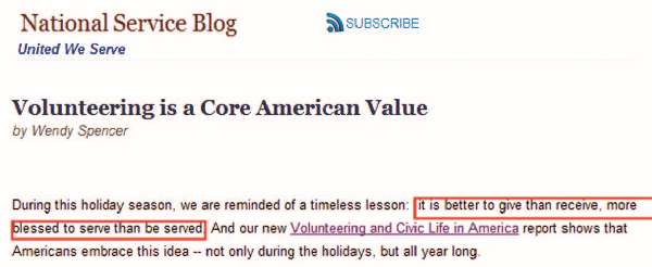 Волонтерская деятельность описана и активно поддерживается СМИ как «корневая американская ценность», ассоциированная с христианскими ценностями (что достаточно интересно как обоснование гражданской позиции на официальном правительственном портале)[365]: