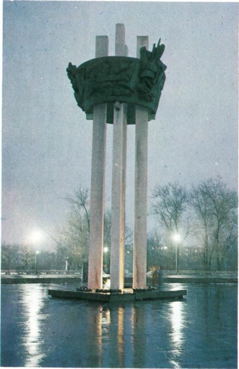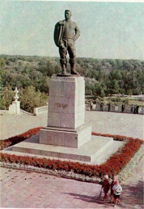 Оренбург — город юности Ю. А. Гагарина. Из окна училища виден памятник Валерию Чкалову.