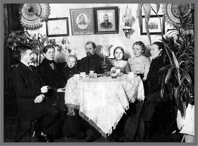 Семья Кучиных. Слева направо: Александр, Фёкла Андреевна, Коля, Степан Григорьевич, Настя, Лиза, неизвестная. Онега. 1912 г. (Из фондов ОИММ)