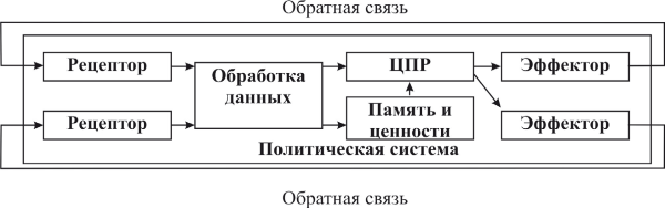 Немецкий политолог К. Дойч дополнил модель Д. Истона, рассмотрев не только внешние связи, но и каналы прохождения и переработки сигналов внутри политической системы. В его представлении сигналы, поступающие из среды, воспринимаются рецепторами политической системы (от. лат. receptor – принимающий), функции которых выполняют институты, связанные с общественной средой, – прежде всего партии, группы давления, отчасти государственные органы и т. п. Отсюда сигналы поступают в блок обработки данных (аналитические структуры, различные формы обмена мнениями), далее – в центр принятия решений (ЦПР) – общественные и государственные органы, формулирующие решения и блок памяти и ценностей. К. Дойч первым рассмотрел в кибернетической, по сути дела, модели политической системы блок памяти и ценностей, обозначив роль и место культуры, устоявшихся стереотипов общественного сознания, которые оказывают существенное влияние на формирование решений. После принятия решения соответствующие команды поступают в эффекторы (исполнительные механизмы), которые формируют сигналы выхода и таким образом воздействуют на среду. Эти сигналы перерабатываются ею и как реакция общества вновь поступают на вход политической системы. В соответствии с избранным подходом К. Дойч определил и элементы политической системы, в качестве которых выступают блоки, через которые поступает и в которых перерабатывается информация.