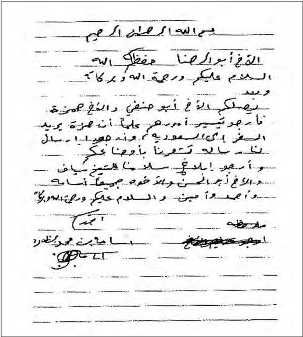Это рукописное послание адресовано Бен Ладеном тому же человеку по имени Абу аль-Реда, что и предыдущий документ (№ 34). На этот раз он просит его принять двух своих приближенных, в том числе своего сына Хамзу, и помочь последнему собрать все необходимые документы для поездки в Саудовскую Аравию.