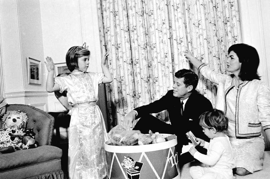 Джеки Кеннеди наслаждалась материнством и обладала весьма легким и веселым нравом, который редко показывала на публике. «Пойдем поцелуемся с ветром», — шептала она своей дочери Кэролайн, прежде чем они выбегали играть на лужайку Белого дома. Здесь она и президент Кеннеди играют со своими детьми, Кэролайн и Джоном Ф. Кеннеди-младшим, в детской комнате Белого дома после совместного празднования дня рождения.