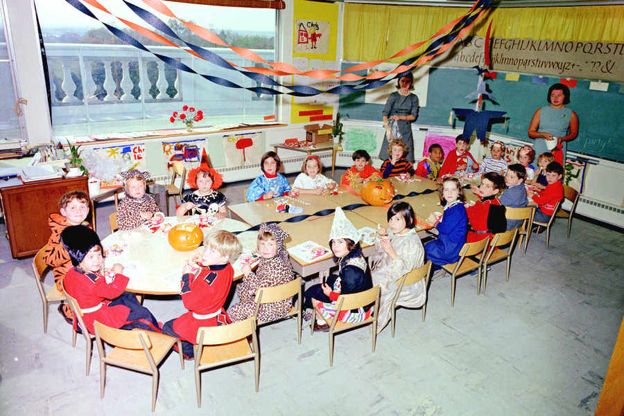 Кэролайн, сидящая в центре стола с красной повязкой на голове, и ее одноклассники празднуют Хэллоуин в детском саду, который Джеки организовала прямо в Белом доме.