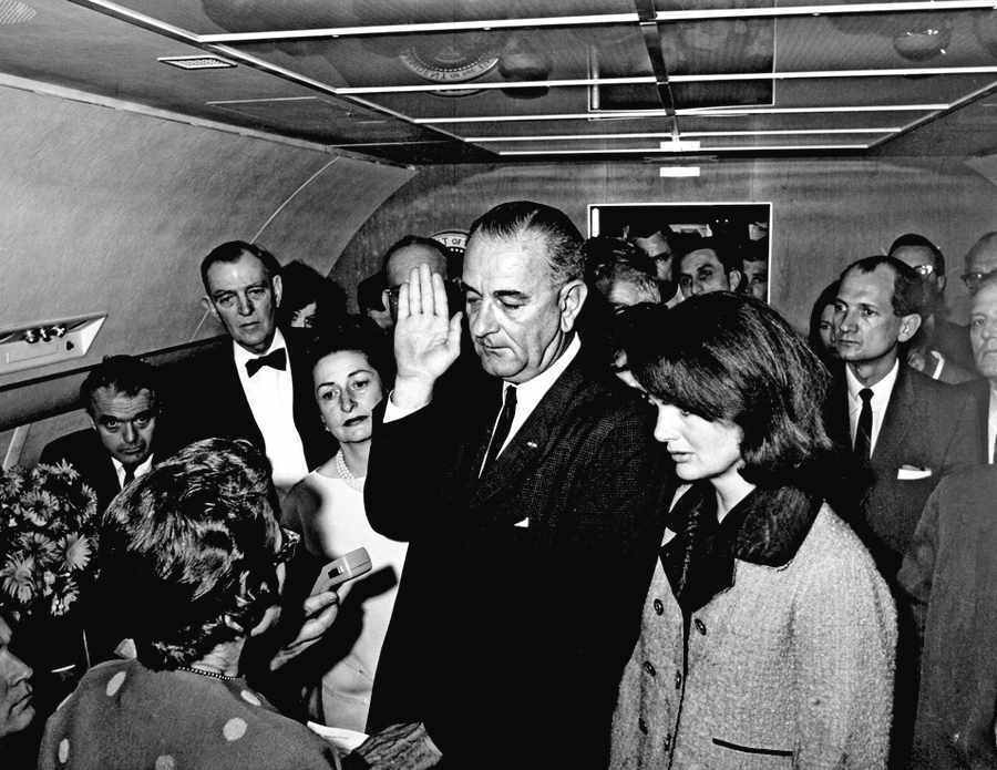 Вице-президент Линдон Джонсон принимает присягу на борту президентского самолета номер один, стоявшего на аэродроме в Далласе, 22 ноября 1963 года, сразу после убийства президента Кеннеди. Леди Берд (слева) так и не смогла убедить Джеки (справа), чье платье все еще было окроплено кровью мужа, вернуться в Белый дом, и ей было больно и обидно, что сделать это Джеки смогла лишь по просьбе Пэт Никсон. Тем не менее сама история, которая свела этих двух женщин вместе, помогла им в дальнейшем установить между собой тесные дружеские взаимоотношения.