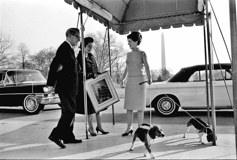 Главный капельдинер Дж. Б. Уэст, Леди Берд Джонсон (с портретом наставника своего мужа, спикера Палаты представителей Сэма Рейберна) и младшая дочь Люси (с двумя биглями) в момент переезда в Белый дом после убийства президента Кеннеди. Леди Берд сокрушалась: «Люди смотрят на живых и жаждут их смерти».