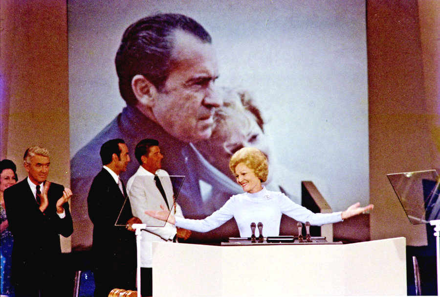 Пэт, которую пресса в шутку называла «Пластиковая Пэт» из-за ее имени, подбадривает аудиторию на Национальном съезде Республиканской партии 1972 года в Майами-Бич. (Позади нее в белом пиджаке стоит Рональд Рейган).