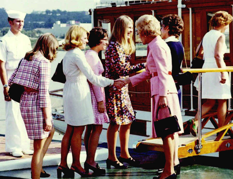 Пэт Никсон приветствует обслуживающий персонал Восточного крыла резиденции Белого дома, отправляющийся в поездку в Маунт-Вернон на борту президентской яхты «Секвойя»