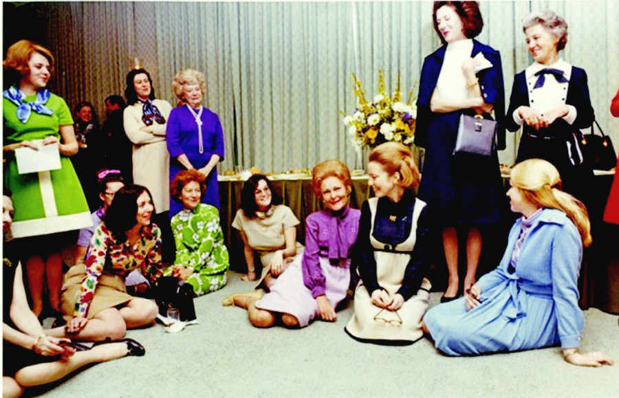 Вечеринка-сюрприз в кинозале Белого дома в честь дня рождения первой леди в 1973 году. Пэт, одетая в зеленое платье, по-домашнему сидит на полу в окружении своего личного секретаря Люси Винчестер, директора по переписке Гвен Кинг и других сотрудниц Белого дома.