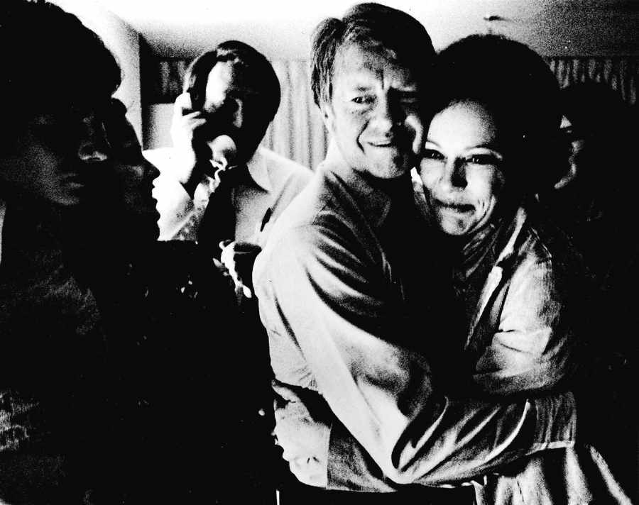 Розалин Картер обнимает своего мужа Джимми в ночь выборов 2 ноября 1976 года.