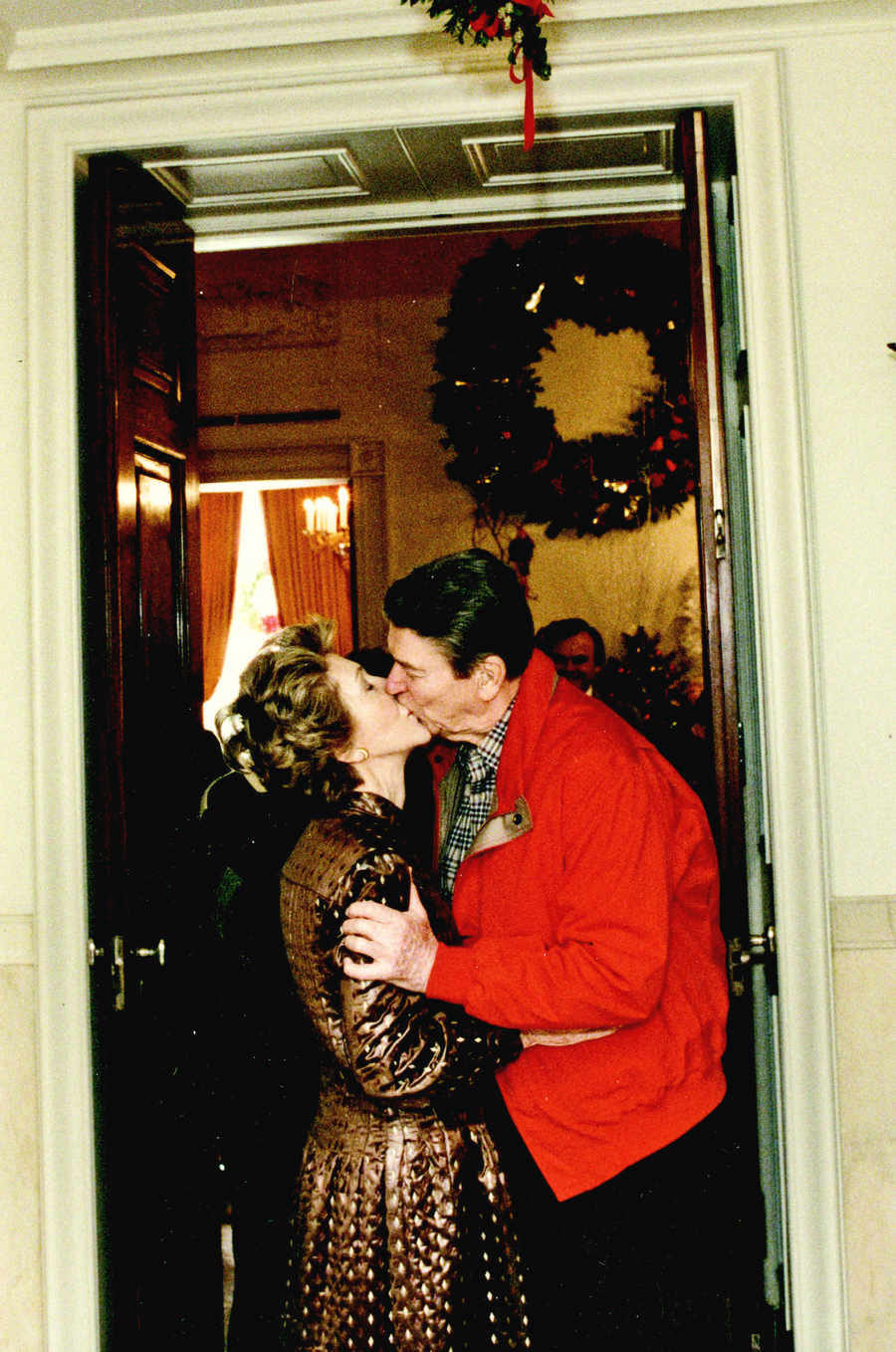 Рейганы целуются под омелой в 1987 году. Эти женщины были ближайшими доверенными лицами своих мужей и самыми ярыми их защитницами. «Моя жизнь началась с Ронни», — призналась Нэнси.