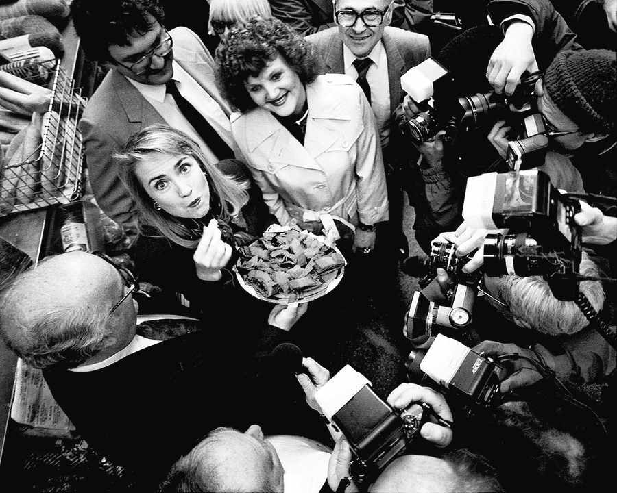 Хиллари Клинтон стала единственной первой леди, которая сама решила баллотироваться на пост президента страны. До этого все свое время без остатка она посвящала политической карьере своего мужа, крича во весь голос: «Кончай заливать!» оппонентам Билла, баллотировавшегося на пятый срок в качестве губернатора Арканзаса. Здесь она агитирует за своего супруга перед президентскими выборами 1992 года.