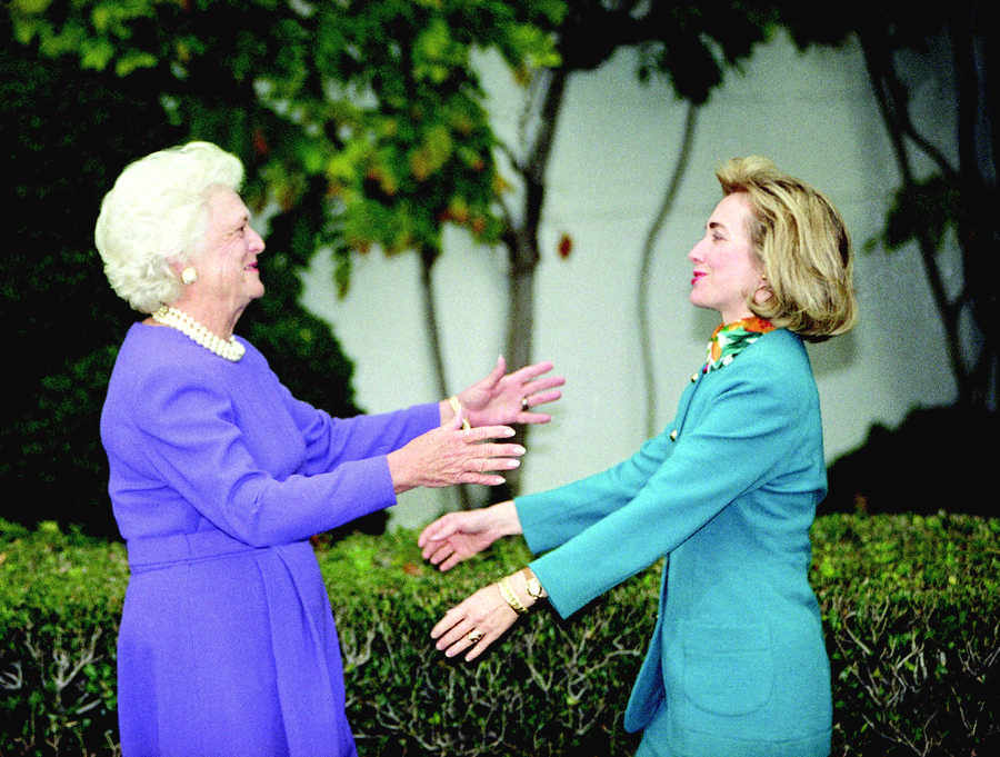 Первая леди Барбара Буш (слева) приветствует свою преемницу Хиллари Клинтон на ознакомительной экскурсии по Белому дому 19 ноября 1992 года. Барбара так и не сможет никогда простить Хиллари за глубоко личные нападки в адрес ее мужа, Президента Джорджа Буша, во время предвыборной кампании.
