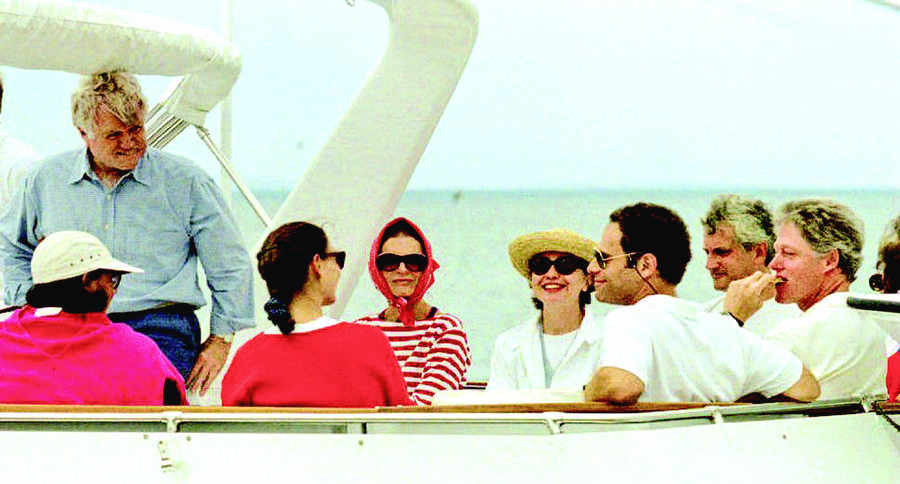 Слева направо: Тед Кеннеди (стоит), Джеки Кеннеди (в полосатой рубашке и солнцезащитных очках), Хиллари Клинтон (в соломенной шляпе и солнцезащитных очках) и Билл Клинтон во время круиза вдоль побережья Мартас-Винъярд в августе 1993 года. Хиллари боготворила Джеки и попросила у нее совета в вопросе воспитания детей в Белом доме. Джеки ответила ей: «Тебе придется научиться занимать твердую позицию».