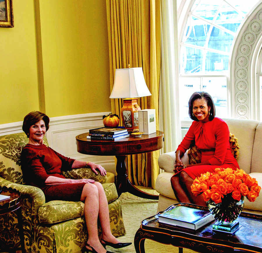 Лора Буш, республиканка, смогла быстрее найти общий язык с Мишель Обама, демократкой, нежели Хиллари Клинтон. Во время предвыборной кампании 2008 года Лора защищала Мишель от критики, которой та подвергалась постоянно, и с тех пор первые леди никогда не упускали возможности взаимно похвалить работу друг друга.