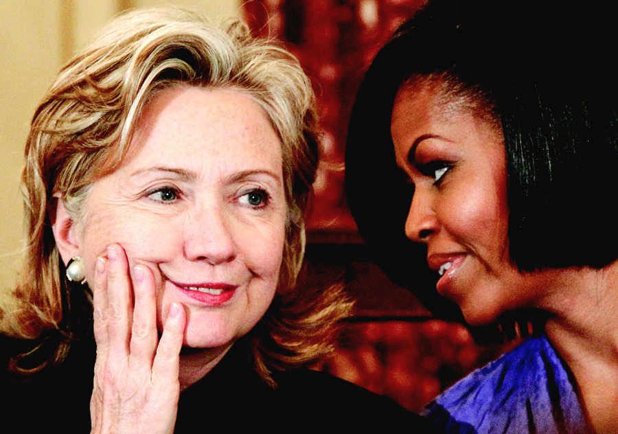 Хиллари, тогдашний государственный секретарь, беседует с Мишель Обама на церемонии награждения в Государственном департаменте в 2010 году. Их двоих нельзя назвать близкими подругами, отчасти из-за обид и нападок, сохранившихся после праймериз в демократическом стане в 2008 году, отчасти из-за того, что они принципиально разные женщины.
