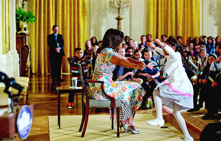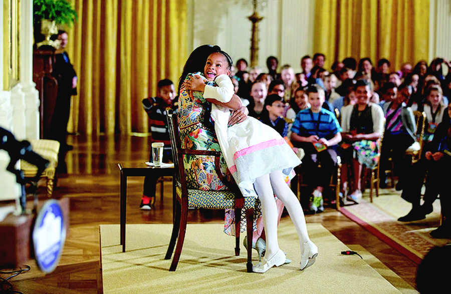 Мишель Обама выросла в рабочей семье в южной части Чикаго и чувствует себя более комфортно, общаясь с юношами и девушками, имеющими за плечами схожее с ней происхождение. «Никогда не приуменьшайте свои мечты», — обратилась она к ученикам, окончившим в 2010 году среднюю школу в Анакостии, считающуюся одной из худших школ в Вашингтоне, округ Колумбия. И еще она известна своей любовью к объятиям. Здесь она обнимает маленькую девочку на одном из мероприятий, проводимых в Восточной комнате Белого дома 22 апреля 2015 года.