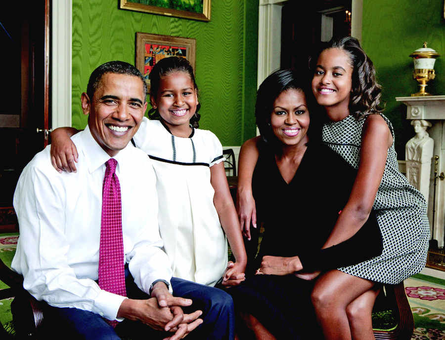 Мишель Обама вошла в Белый дом, охарактеризовав себя как «мама-главнокомандующая», и любовь и забота о двух дочерях остались навсегда ее главным приоритетом. Когда президентский срок их отца подойдет к концу, Саша уже перейдет в среднюю школу, а Малия поступит в колледж. Чета Обама позирует для семейного портрета в 2009 году в Зеленой комнате Белого дома. Саша обнимает своего отца, а Малия сидит в обнимку с мамой.