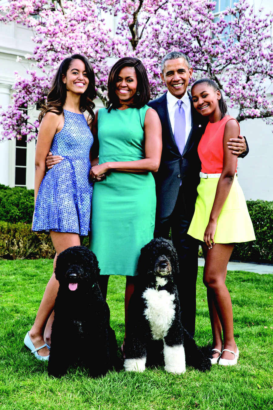 Семья Обама в 2015 году в Розовом саду. Малия слева, а Саша справа от родителей позируют на фоне своих любимцев — португальских водяных собак Санни и Бо.