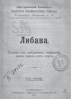 Титульный лист. «Либава, Указания для эмигрантов, направляющихся через этот порт». Издание Центрального комитета Еврейского колонизационного общества. С-Петербург, 1911 г.