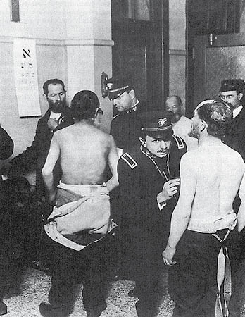 Медосмотр мигрантов, прибывающих в США, на острове Эллис в бухте Нью-Йорка