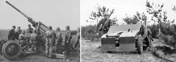 Польская армия на учениях весной 1939 г. Слева польская зенитная 75-мм пушка образца 1936. Справа польские 37-мм противотанковые пушки wz.36 Бофорс.