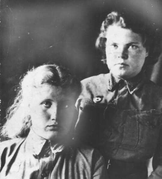Нам было сказано, что мы можем занять только крайний дом, так как пол села занято немцами. Все в этот дом набились как селедка в бочку. Я ехала в последней машине. Места в доме мне уже не досталось. Я как села на корточках в сенцах, так и уснула. Утром встали, ноги отекли. Молодежь выскочила, давай в снежки играть. Прибежали солдаты, нас загнали в дом и запретили выходить. В деревне еще немцев полно. Когда мы выбежали на улицу прибежал наш командир медсанбата Чевычев. Мы еще его дразнили «Пятки вместе, носки врозь». Запретил нам из дома выходить. Я смотрю по улице ведут троих пленных немцев. Тут прилетел немецкий самолет и сбросил на нас бомбу. При взрыве ранило, контузило командира автороты. Представительный мужчина, высокий, солидный и в очках. Когда пыль осела, мне вручают этого командира и приказали его вести. Я его веду, придерживаю, тащу его вещмешок. Вдруг опять летит самолет, да так низко. Такие наглые были эти немецкие летчики, летят ничего не боятся. Дал по нам очередь из пулемета. Я этого командира завела в ближайший дом. Там около топки печи на полу сидела странно одетая девушка. В черной телогрейке и черной с короткими ушками шапке, без ремня. Я посадила раненого на скамью у стены к окну, а сама села на порог. Спрашиваю эту девушку: