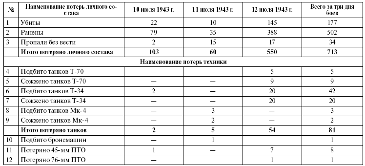 Потери личного состава и материальной части 2 гв. Ттк за первый период Прохоровского сражения 10–12 июля 1943 г[797].