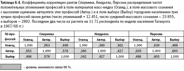 Увы, анализ содержания (контент-анализ) всех масс-медиа на предмет освещения конкретных профессий в последние годы не проводился. Однако и из показанных выше исследований видна резкая ограниченность текста узким кругом профессиональных групп в тексте. Здесь, когда две социальные группы «гегемона» занимают 97 % упоминаний личностей в тексте, аппарат ранговой корреляции между ориентациями населения и виртуального ряда ничего не даст. Другое дело – замер в стартовой точке процесса в 1967/68 гг. Здесь были взяты упоминания 50 профессий (12 451 текстовое упоминание без фотографий), оценки авторитета этих же 50 профессий у населения и приоритеты в выборе трех лучших из этих 50 профессий своим детям[136]. Затем ряд был сужен до 20 профессий, у которых был рассмотрен набор присущих им социальных характеристик, которые, конечно же, могут влиять на выбор профессии и дальнейшую ориентацию следующих поколений. Тут и выявились примечательные моменты. Но все по порядку.