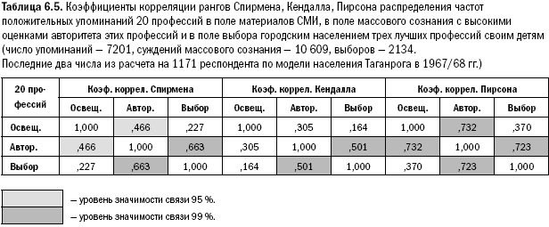 Итак, ряд оценок массовым сознанием авторитета 50 профессий сильнее коррелирует с рядом положительного освещения в масс-медийном информационном ряду, чем ряд выбранных респондентом в качестве успешных профессий с этим масс-медийным освещением. Выбор всегда дает более высокую корреляцию с оценками общественного авторитета профессий, чем с картиной положительного освещения этих профессий в масс-медийном ряду. Кроме того, везде, кроме одного исключения с коэффициентом Пирсона, ряд оценок авторитета профессий коррелирует с рядом освещения масс-медиа в меньшей степени, чем ряд выбора профессий с рядом авторитета их во мнении людей. Ясно, что СМИ влияют на выбор людей косвенно. Но здесь же надо сделать методически важное замечание. Коррелируя ряды в 50 профессий, мы фактически замыкаем поля масс-медийной информации, массового сознания, прожективного выбора на почти предельно возможном предметном ряду общественных трудовых форм. Здесь очень сильно влияние стохастического процесса, развертывающегося в полном наборе предметного ряда[137]. В. В. Сазонов, однако, выделил из этого ряда в исследовании список в 20 профессий, которые были исследованы на предмет приписывания им опрошенными определенных социальных свойств, и мы прокоррелировали во всех трех рядах и эти 20 профессий[138]. Здесь плотность распределений и резкость корреляций в выборе были четче.