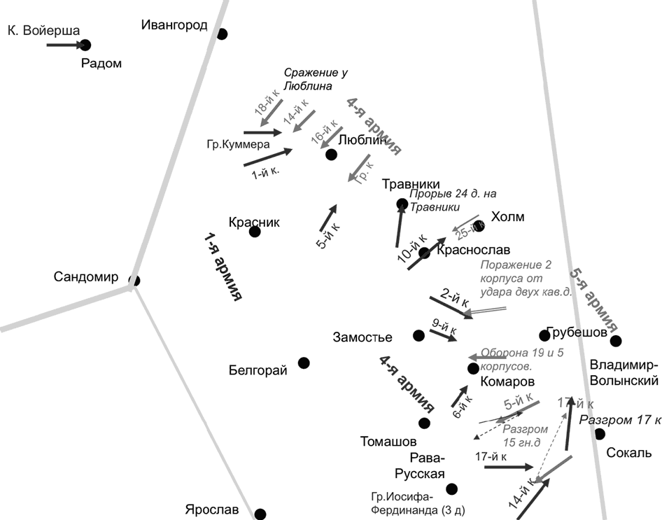 25-й корпус, действующий на правом фланге 5-й армии Плеве, не только не смог наступать на Замостье, как того требовал командующий армией, но и потерял утром 30 августа Краснослав, после чего стал отходить к Холму. Выход к этому важнейшему узлу дорог, где, кстати, располагался штаб армии, делал положение 5-й армии совершенно невыносимым и, по сути, означал изоляцию 4-й и 5-й армий и их поочередный полный разгром. Плеве приказ командира корпуса отменил и потребовал 31 августа во что бы то ни стало вернуть Краснослав.