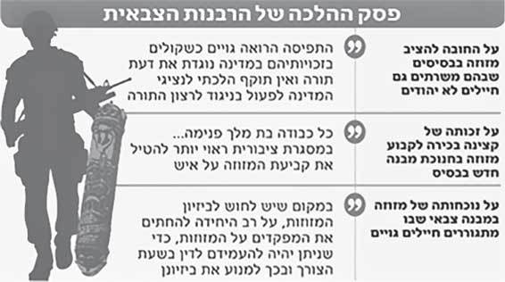 Про историю с прибиванием мезуз я уже написал выше. Автор выпуска этой книги — главный армейский раввин Рафи Перец, выходец из Марокко. Недавно главный военный раввинат выпустил наставление о том, как прибивать мезузу, в которой объясняется, что в еврейском государстве «гои» не могут иметь равные права с евреями. http://news.israelinfo.ru/law/45337