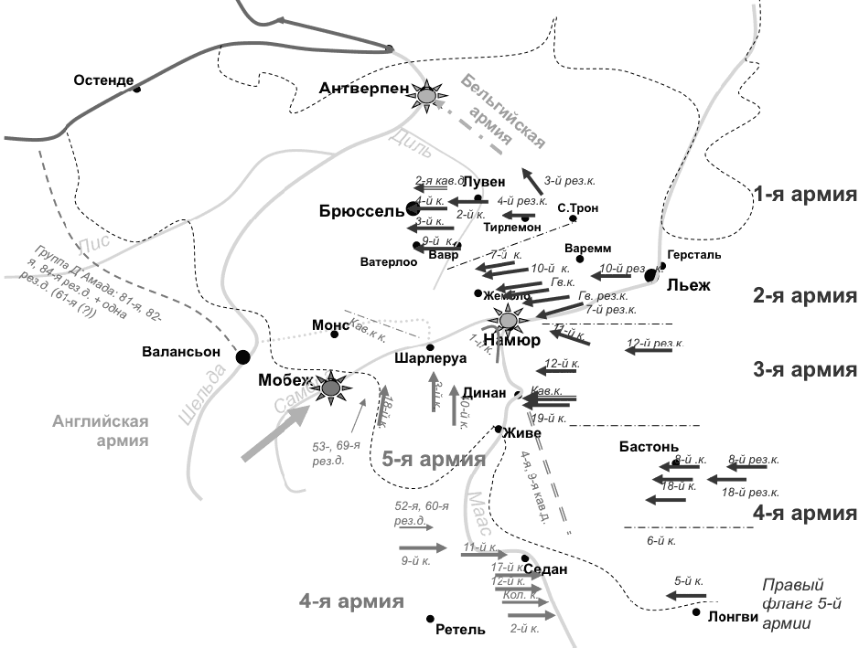 В Текущей Реальности к 20 августа бельгийцы отходят к Антверпену, преследуемые 3-м резервным корпусом (в ближайшей перспективе ему на помощь придет 9-й резервный с датской границы), 1-я германская армия вышла на линию Брюссель – Ватерлоо, 2-я блокировала Намюр и развернулась к северу от него по линии Жемблу – Охен, 3-я подошла к Маасу и завязала первые стычки с французской кавалерией. Четвертая германская армия достигла западной границы Люксембурга.