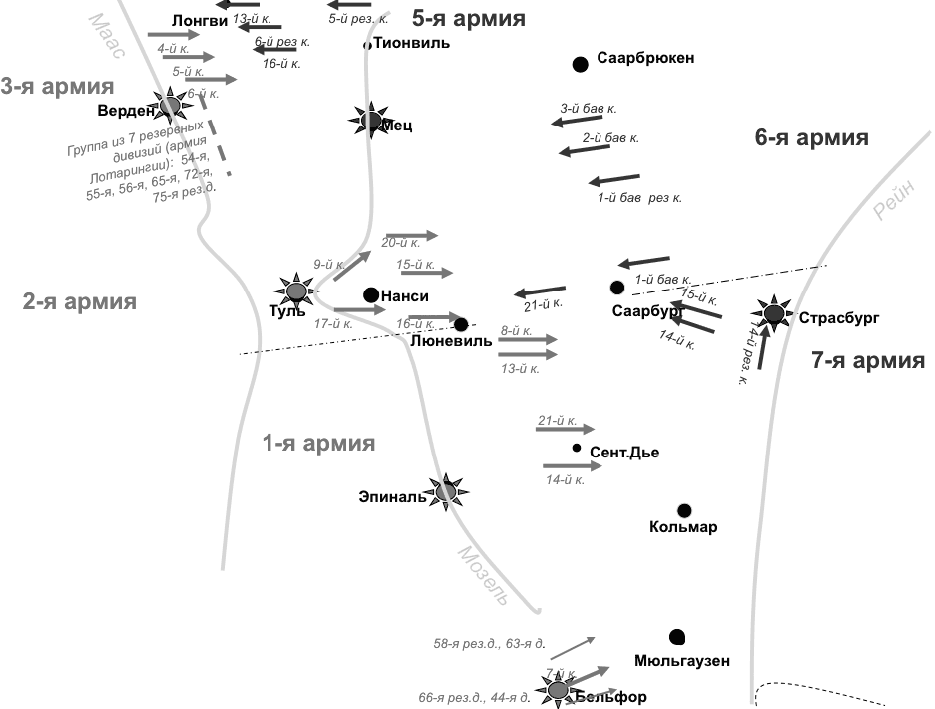 Левый фланг оттянут к востоку, центр находится восточнее Мааса, причем 5-я германская и 3-я французская армии находятся в районе Меца (во всяком случае, ближе к Мецу, чем к Вердену), правое крыло целиком находится за Маасом, противостоящие ему войска разбиты, чем обеспечивается свобода действий для 1, 2 и 3-й армий.[47]