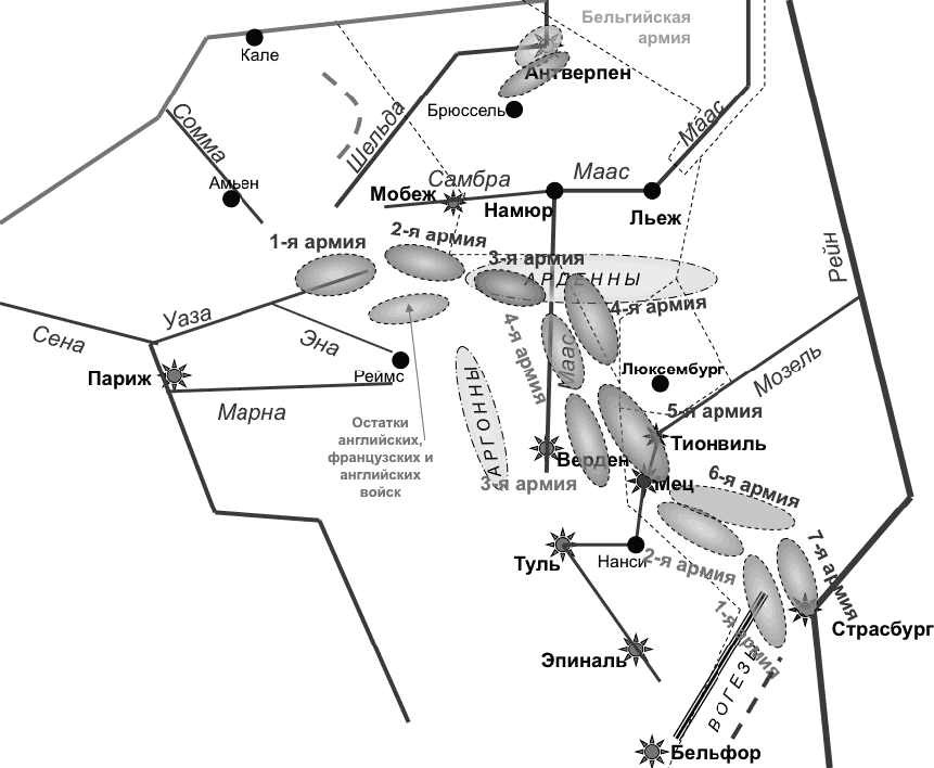 В рамках логики Шлиффена немцам следовало стремиться получить к концу сражения следующую оперативную конфигурацию: