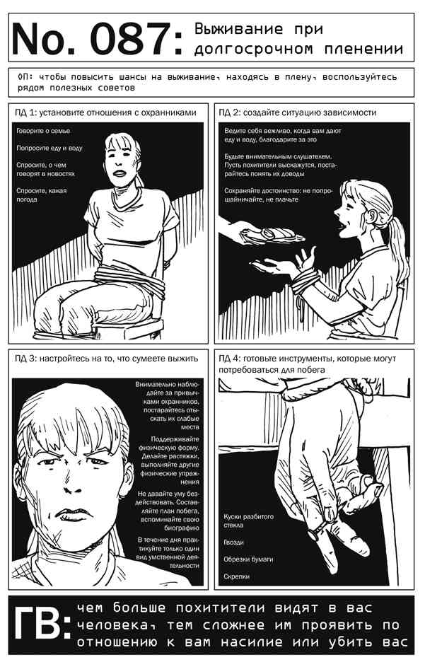 Никто вам не расскажет, как именно может выглядеть путь к спасению из плена, но в любом случае нужно, чтобы вас на какое-то время вывели из места заточения, чтобы вы могли оглядеть окрестности и получить другую полезную информацию или понять, где ее можно получить. Используйте любые, даже самые кратковременные, возможности для сбора информации и ее анализа. Где располагаются выходы? Где находятся охранники? Когда они уходят поесть?